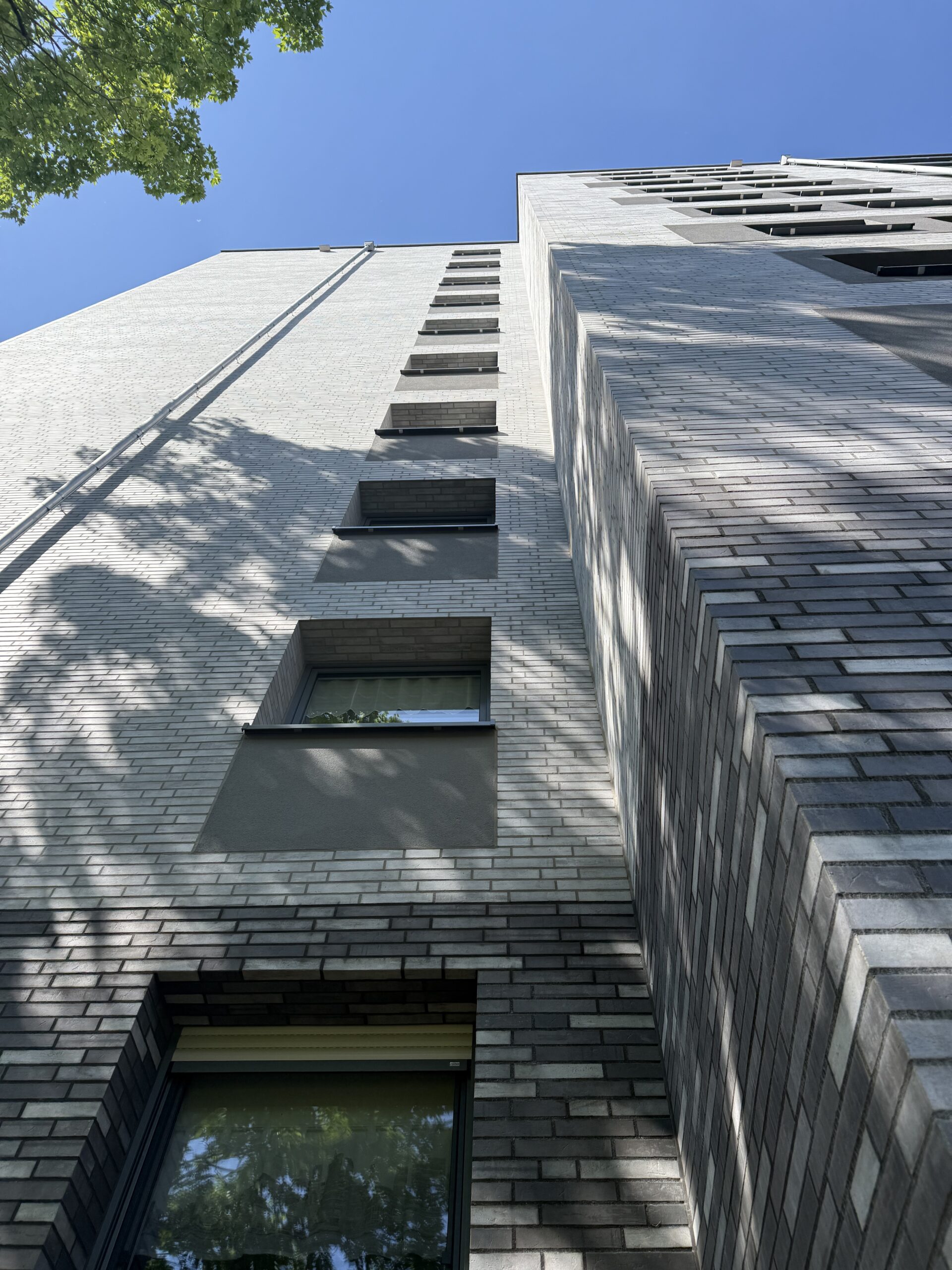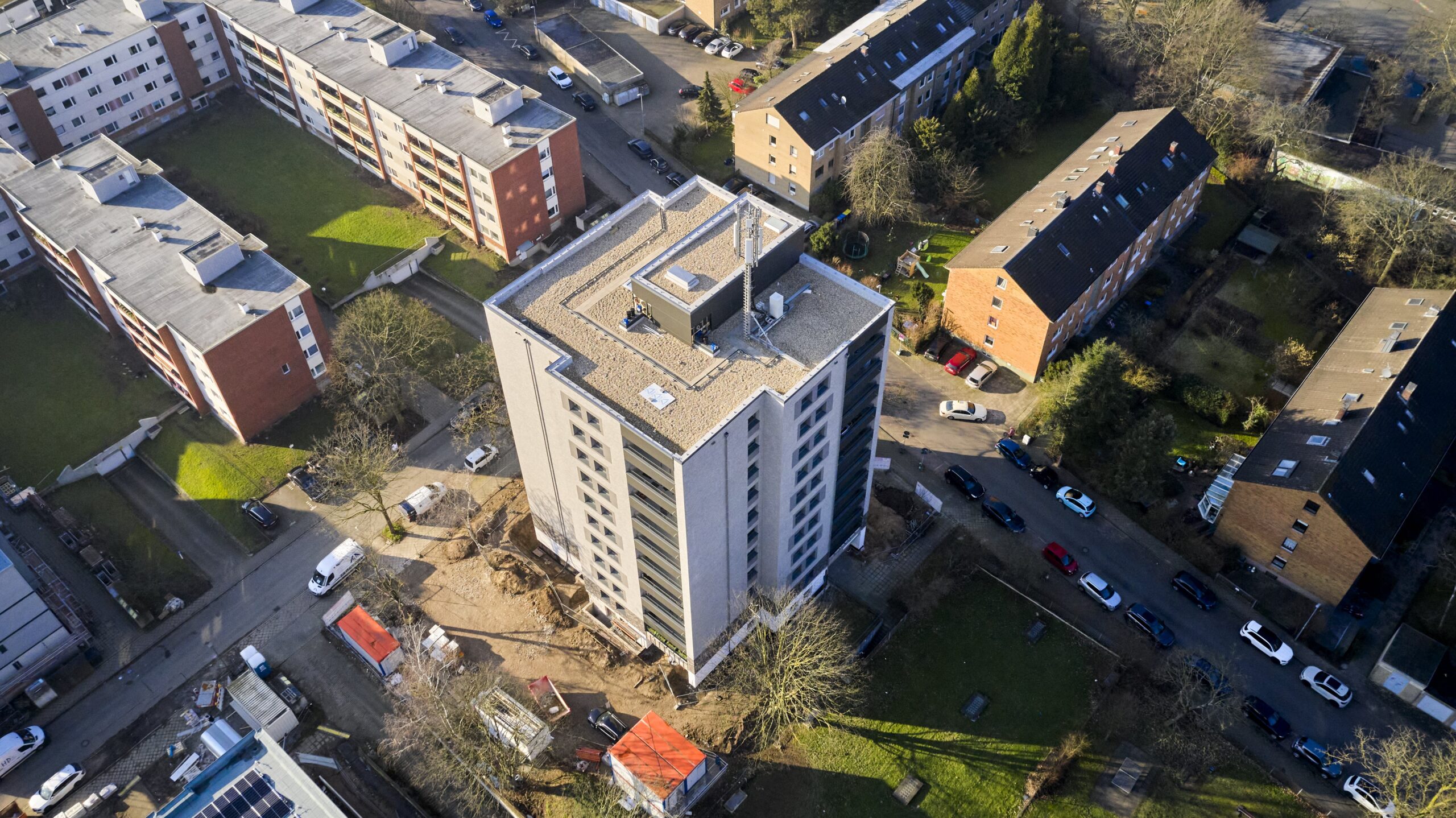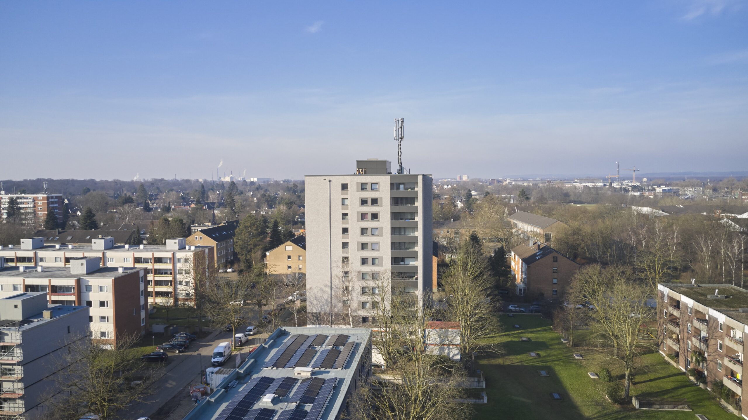 In einem südlichen Stadtteil von Düsseldorf wird derzeit eine umfassende energetische Sanierung zweier baugleicher Wohnhochhäuser durchgeführt. Die Gebäude wurden Anfang der 1970er Jahre von der Düsseldorfer Wohnungsgenossenschaft errichtet und umfassen jeweils 41 Wohnungen auf 11 Etagen. Ziel der Maßnahme ist eine vollständige Erneuerung der Fassaden- und Dachflächen sowie der Austausch sämtlicher Fenster, verbunden mit einer gestalterischen und technischen Aufwertung der Gebäudehülle.