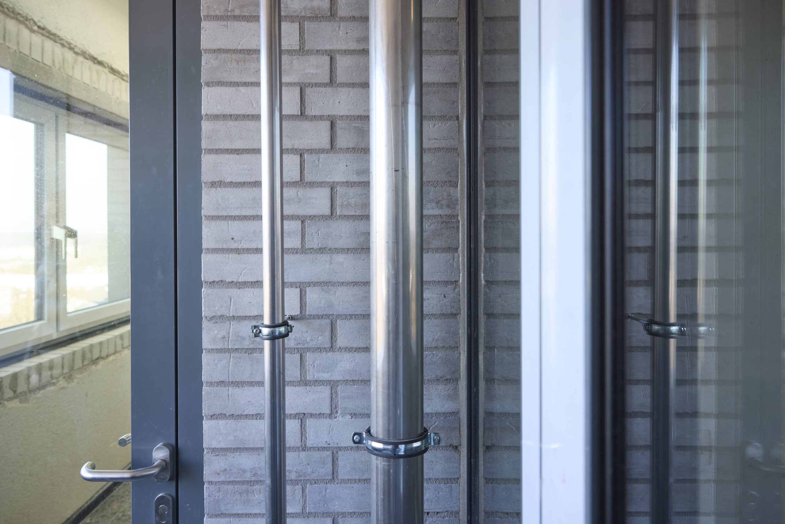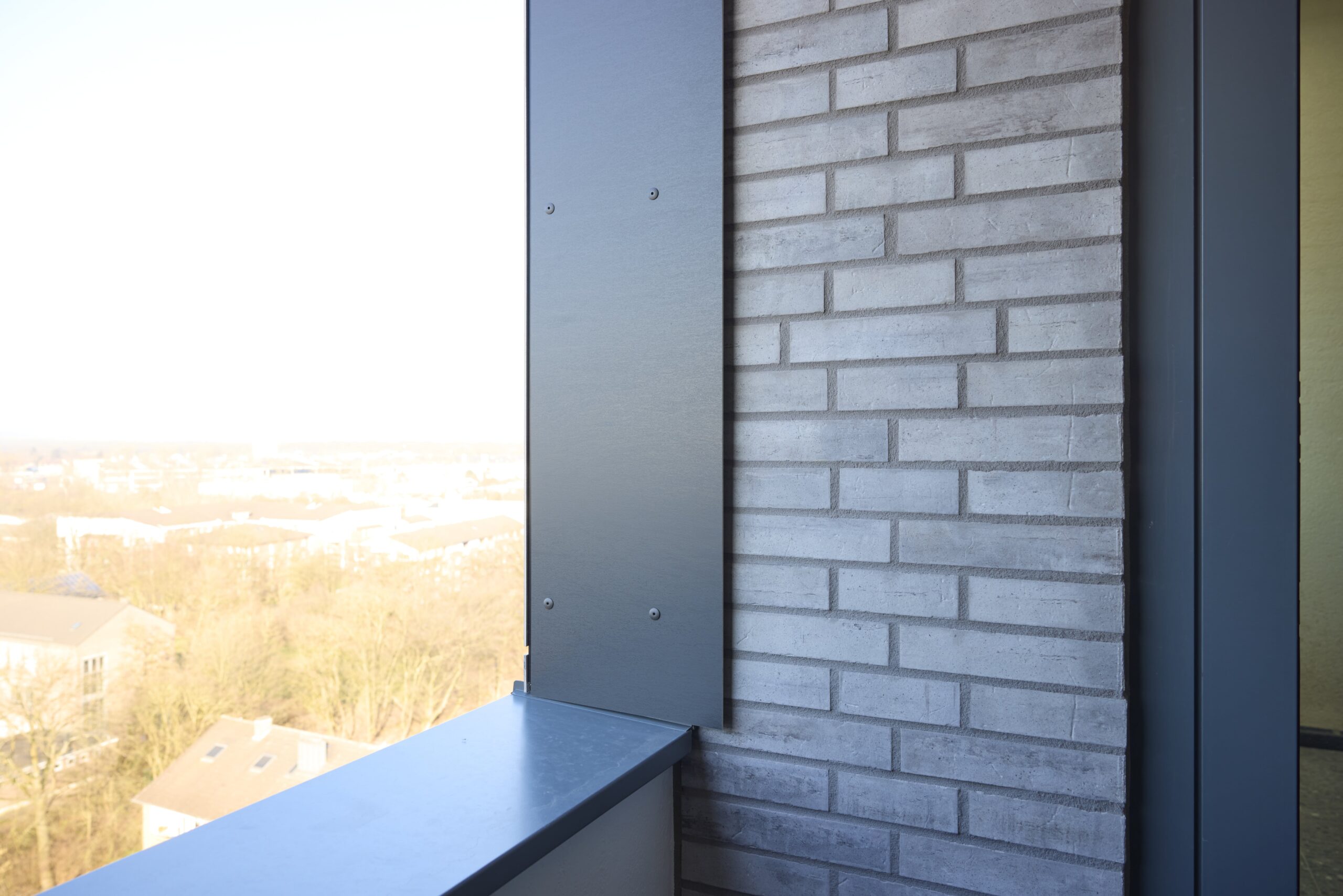 Besondere gestalterische Aufmerksamkeit erhält der Treppenhausbereich. Dort werden die bestehenden Glasbausteine durch großzügige Fensteranlagen ersetzt, die für mehr Tageslicht und eine bessere Belichtung der Erschließungszonen sorgen. Die neue Treppenhausfassade wird als vorgehängte hinterlüftete Konstruktion mit Fassadenplatten ausgeführt, die sich gestalterisch in das Gesamtkonzept einfügt und auch bei den Balkonbrüstungen zur Anwendung kommt.